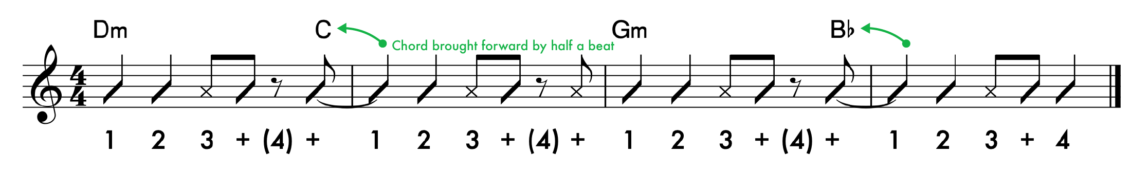 When we look at the chord progression, we can see that there is basically one chord per bar, but the chords in the second and fourth bars have been ‘displaced’ and brought forward by half a beat.