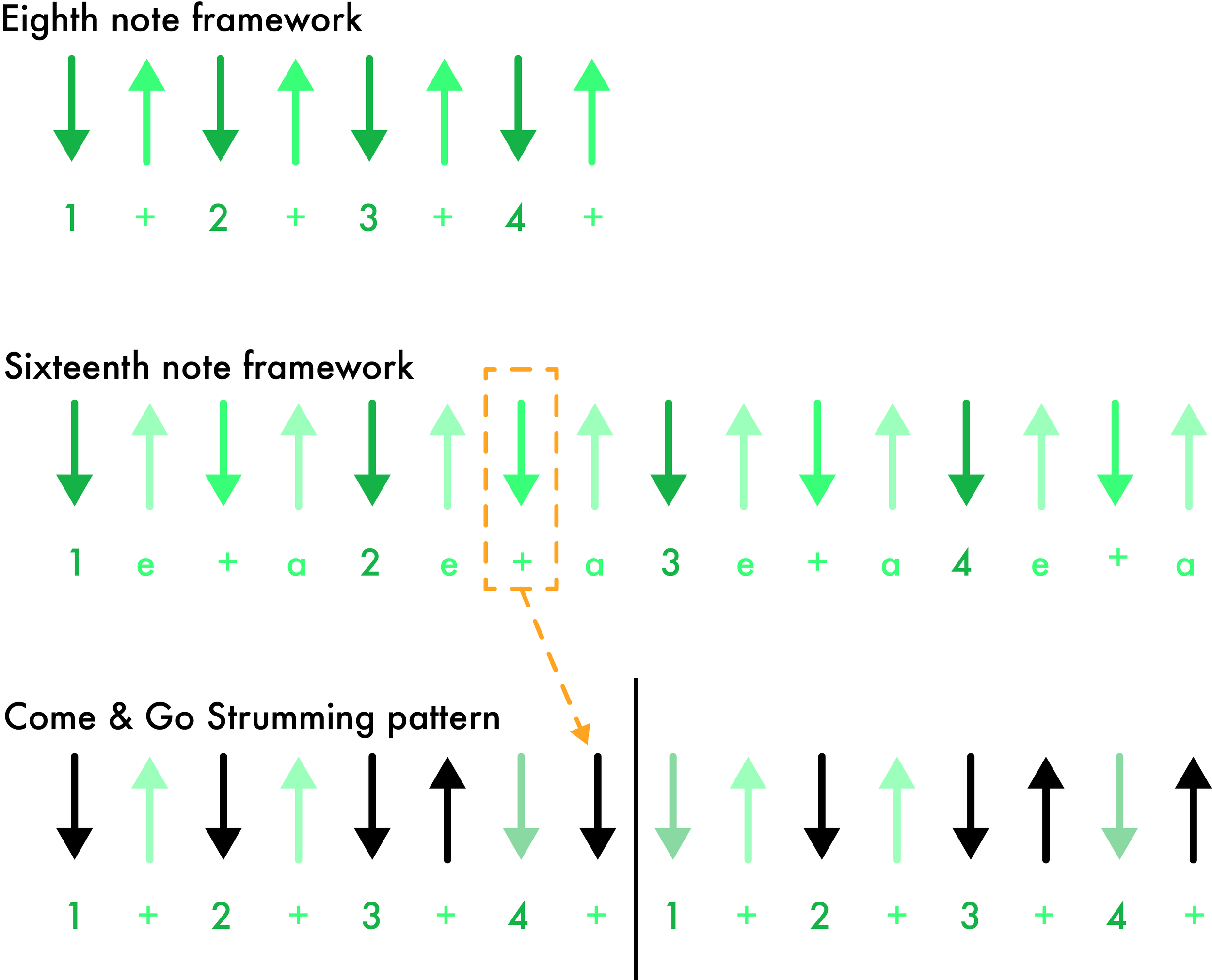 The majority of this strumming pattern uses an eighth note framework. However, it doesn’t quite feel right if we hit the next chord with an up-strum (which is what we would usually use for the off-beat of beat four in an eighth note framework). Although we’ve displaced it, we still want to hit the first beat of the chord with a strong strum. Down-strums will always have more weight to them than up-strums as we are hitting the low strings first. But in order for us to be able to play a down-strum when we hit this chord, we’ll have to borrow from a sixteenth note framework.