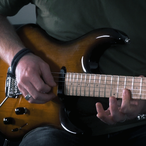 In the case of this riff, when we fret a note on one string preemptively to roll down to a lower string, we do so with the flat part of our finger rather than the tip. We actually use the tip to mute the string we’re going to be going to before we need it. And, when it’s time to roll down to it, our finger has been placed so that we land perfectly using the tip of our finger on the new string. Knowing exactly how far down the tip of your finger you need to use to play the first string of the finger-roll can take some practice. If you’re still getting used to this, practising the finger-roll backwards (starting with the tip of your finger and rolling down to the flat part of your finger on the higher string above) can help. When you do this, you’ll notice where the string lands on the flat part of your finger and you can make a mental note of that position for next time.