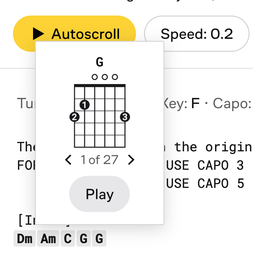 Let’s say we wanted to learn The Fate of Ophelia by Taylor Swift. This version has a note saying: for easier chords, use capo 3 and transpose the chart down.