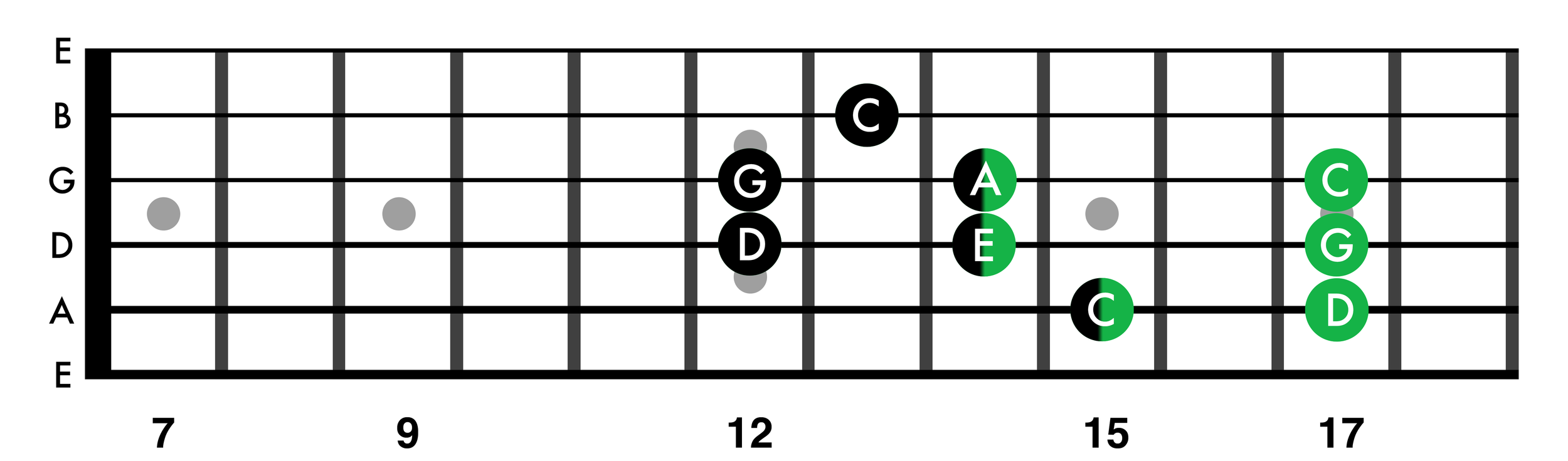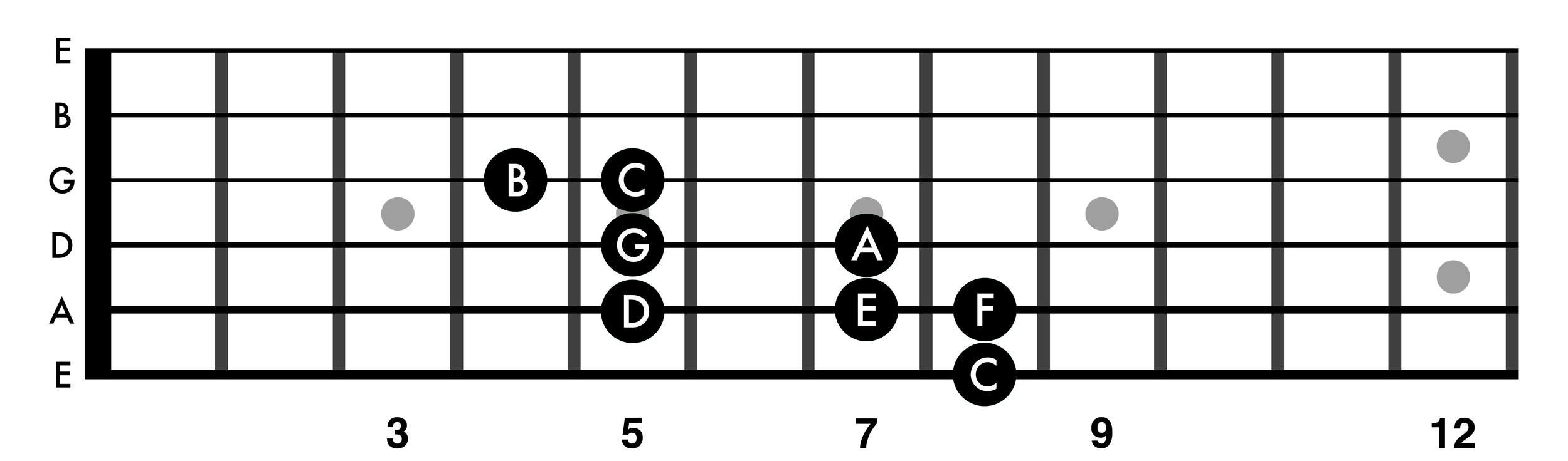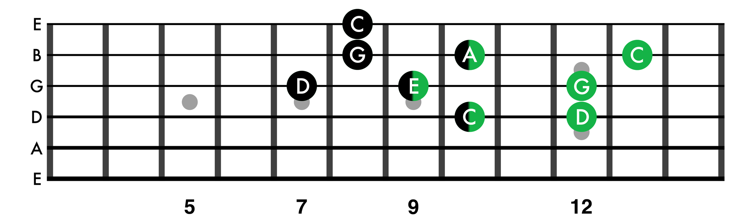 So far we have used Pentatonic Pattern 1 to play our minor pentatonic scale all over the fretboard. We can also use it to play our major pentatonic scale all over the fretboard. This time we will work with the key of C major. It’s the relative major of A minor, which means they share exactly the same notes. We will go through the same process we did with the minor pentatonic scale.