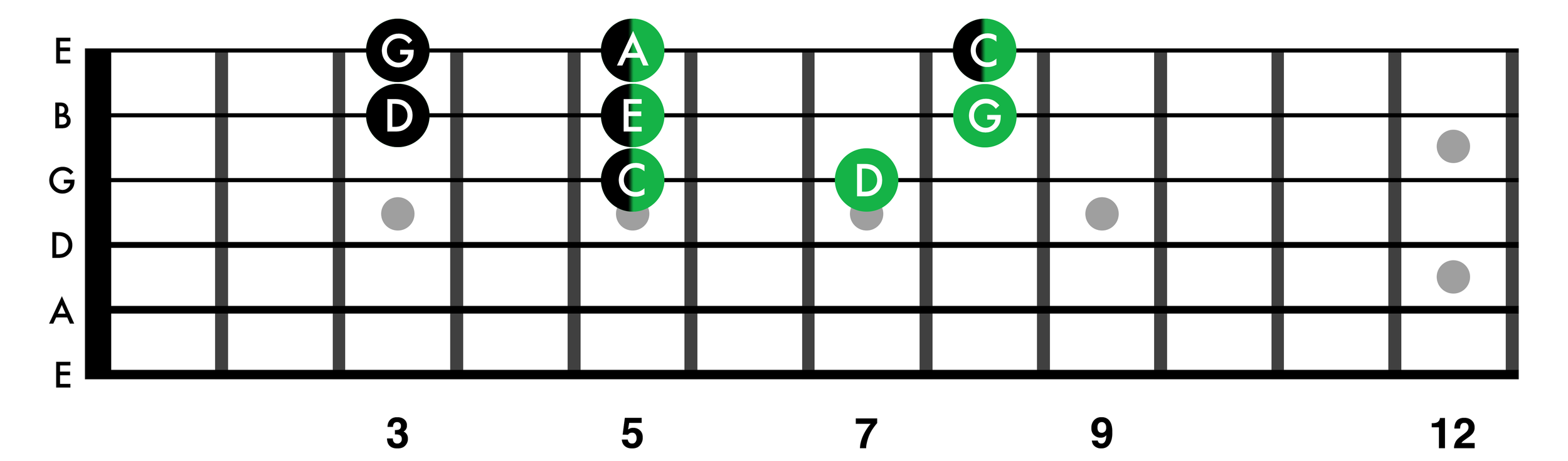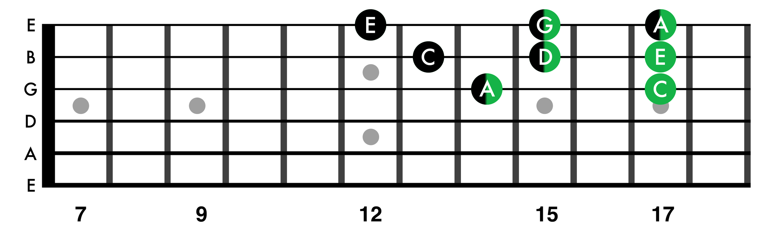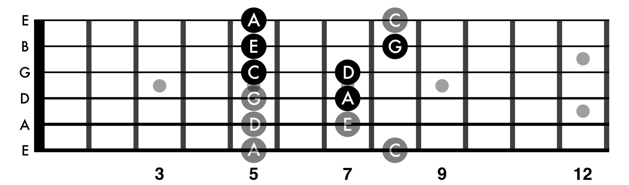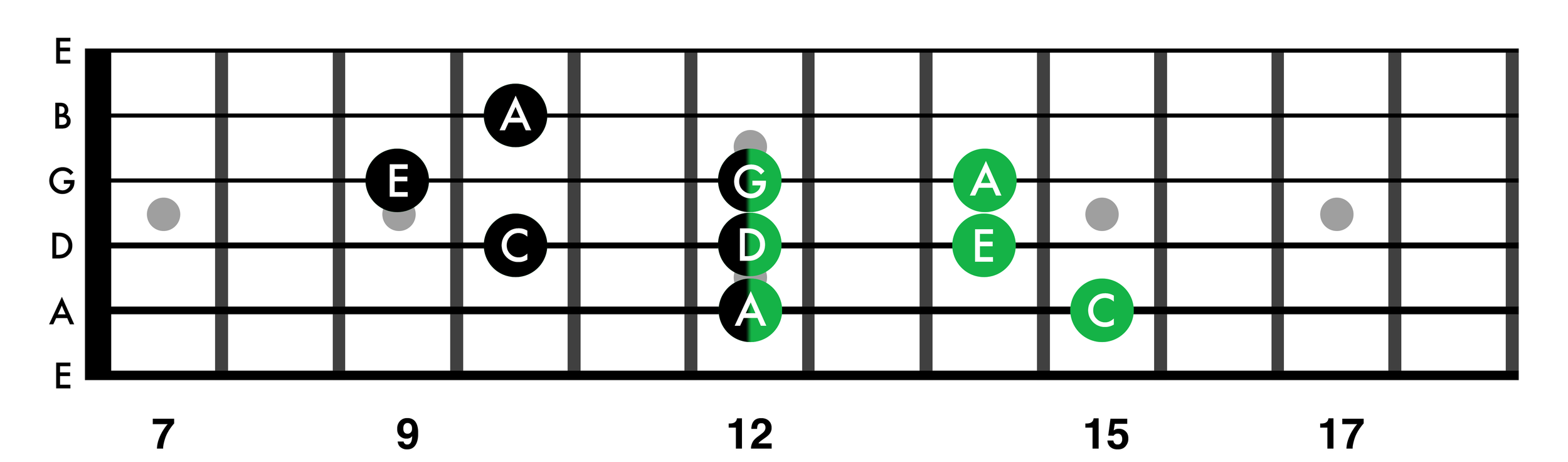 If we break the A minor pentatonic scale into two separate octaves, you’ll notice we get two patterns. The right expression of the scale with the notes arranged to the right of the root note.