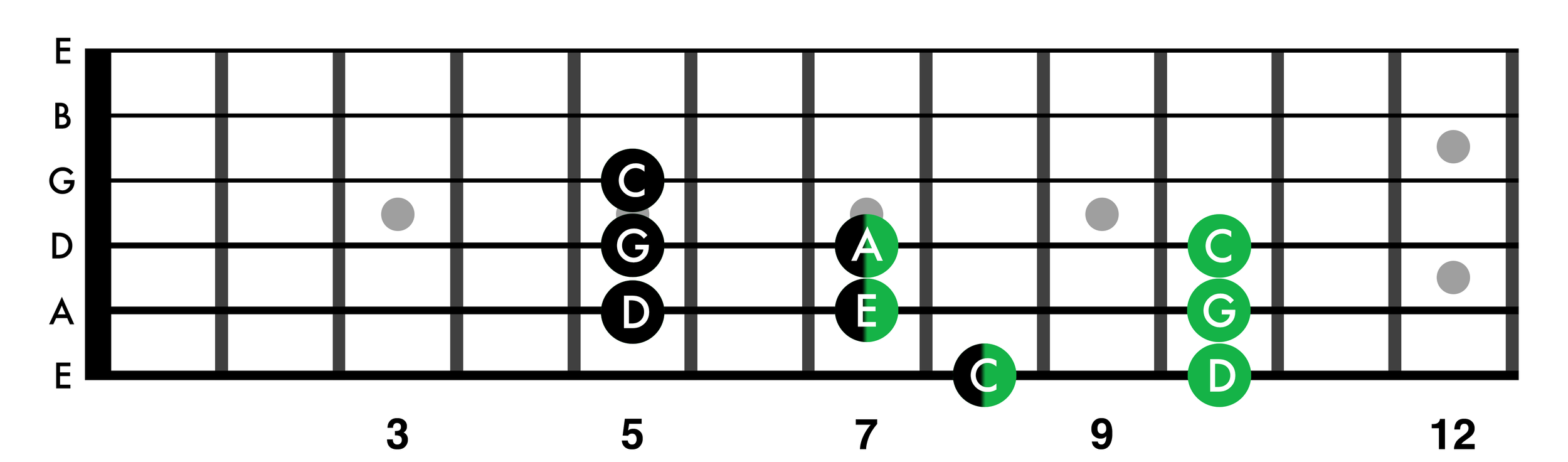 Once we have done this, we can take the B string into account and move the pattern to our root note on the Low E string.