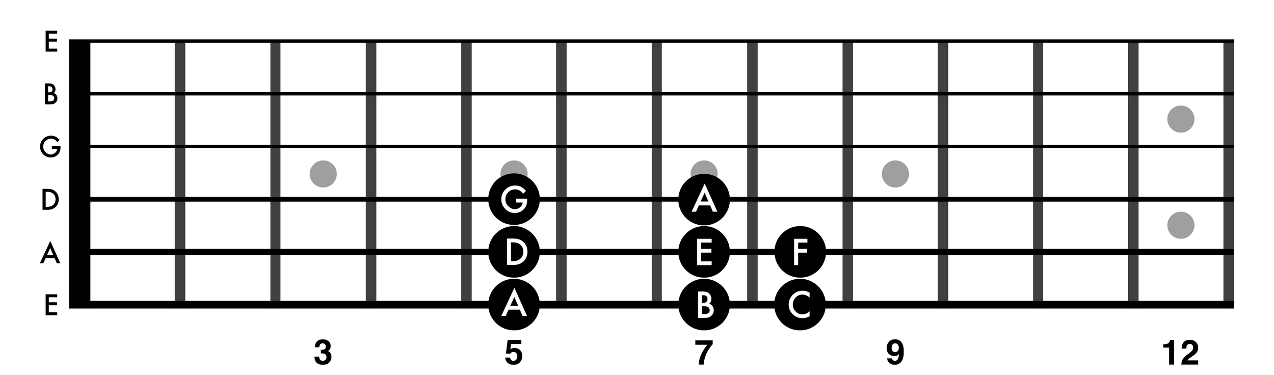 To play the A minor pentatonic scale you have to start on ‘A’ and end on ‘A’, playing through Pattern One.