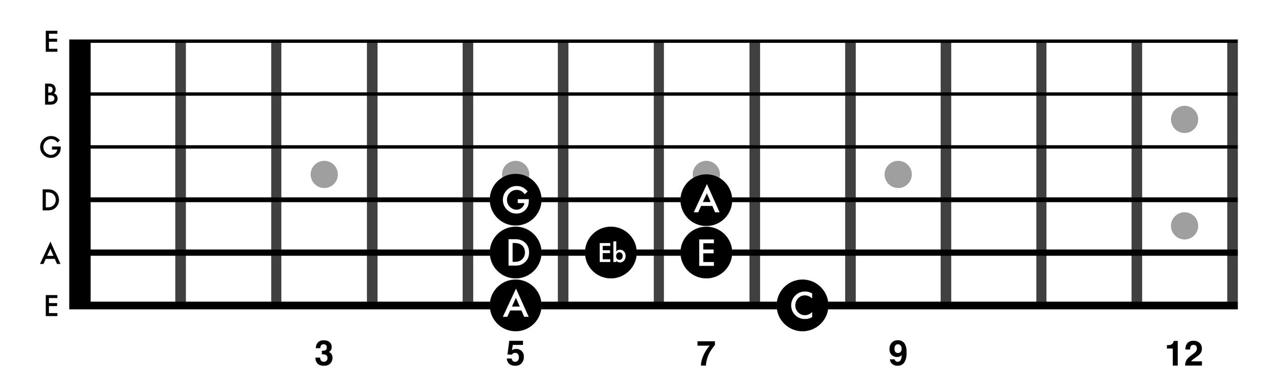 Fig. 6: The A minor Pentatonic Pattern 1 starts on A (Low E string, fifth fret) and ends on C (High E string, eighth fret).