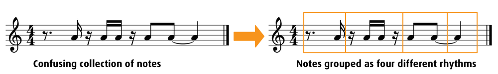 The goal of Happy Clappy Class was learning to recognise and understand rhythms. This meant that when we encountered them in our playing, we wouldn’t be trying to figure them out on the fly. We learned what it felt like to play different rhythms, so when we were reading charts, we would see the notes as groups of rhythms rather than random black dots on a page. Notice how the example below is broken into manageable chunks? Happy Clappy Class taught us to read this bar as four separate rhythms we already knew, rather than a cluster of random notes.